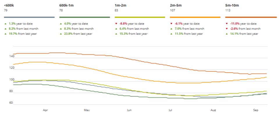 Days on market for all Manhattan property types <$10M, April 2019 – September 2019 (Urban Digs)