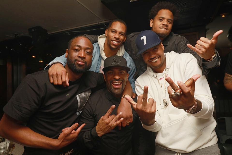 NEW YORK, NY – APRIL 10: Dwyane Wade; Victor Cruz, DJ Clue and Carmelo Anthony are seen at Dwyane … [+]