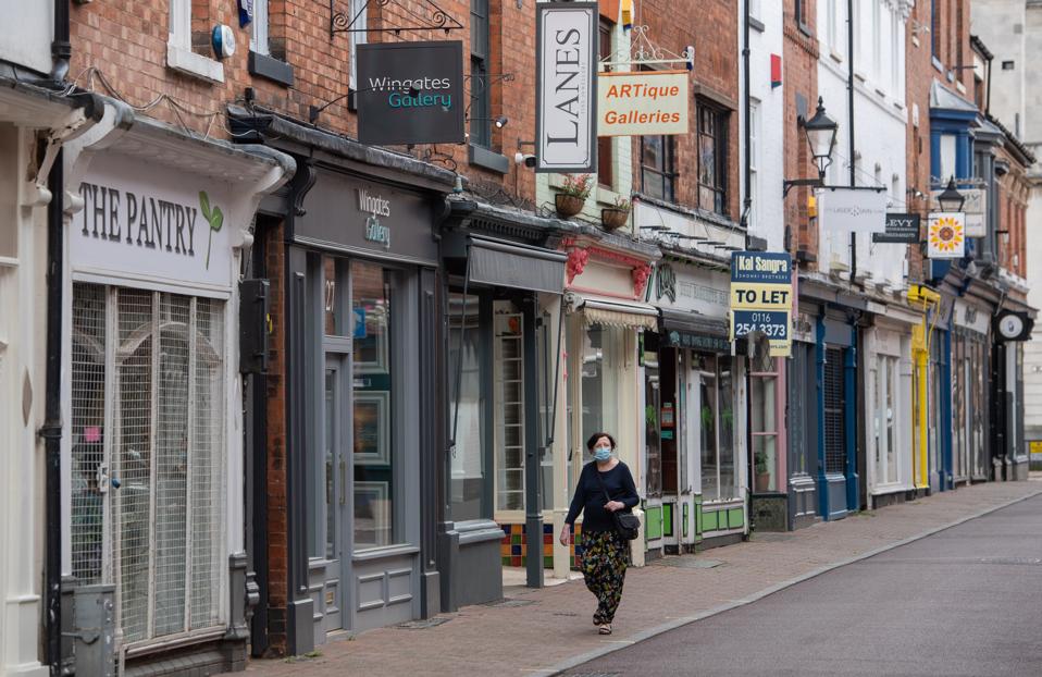 A woman wearing a face mask walks along a steeet of closed shop in Leicester where localised … [+]