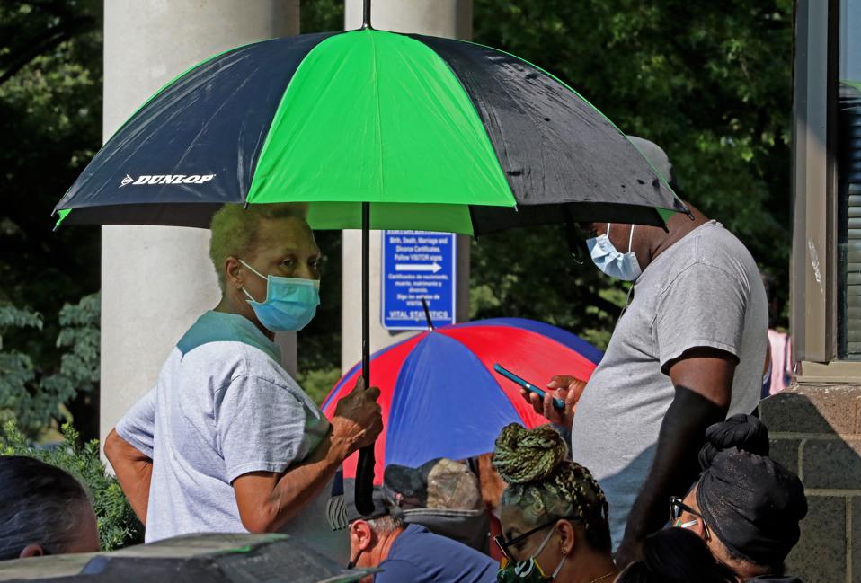FRANKFORT, KY – JUNE 19: Hundreds of unemployed Kentucky residents wait in long lines outside the … [+]