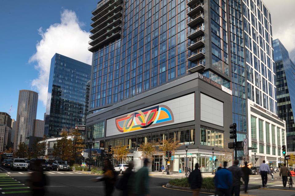 In partnership with Marianne Boesky Gallery, Seaport has commissioned Stella to create the enormous mural. Global creative house Justkids oversaw its production, which is now visible on the façade of a building called One Seaport (60 Seaport Boulevard in Boston.)