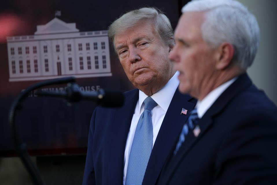 WASHINGTON, DC – APRIL 15: U.S. President Donald Trump listens as Vice President Mike Pence speaks … [+]