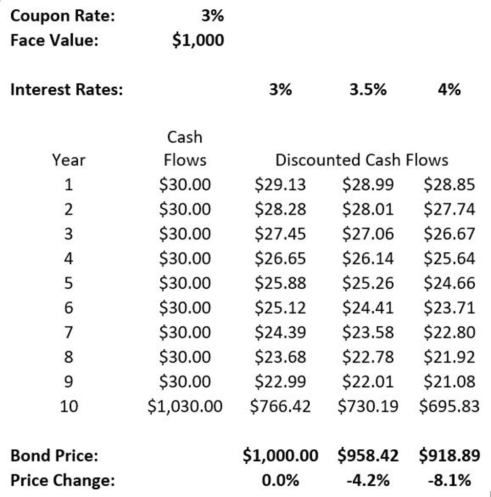 Bond prices are sensitive to interest rate changes, and bond duration is a measure of just how sensitive. For instance, in Exhibit 1.1 (shown in my last article), an increase in interest rates for the simple bond from 3 percent to 4 percent caused the bond’s price to fall by 8.1 percent. This bond has a duration of 8.1, meaning that a 1 percent rise in interest rates leads to an 8.1 percent drop in price. The bond duration is measured in years, and the weighted-dollar average for the time when the cash flows are received in this example is 8.1 years.