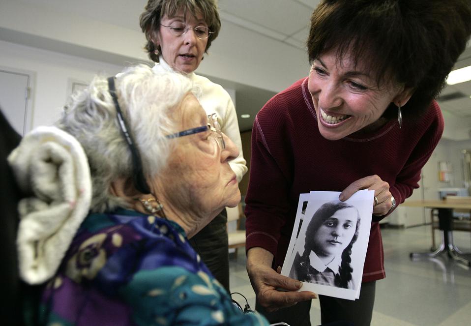 Esther Meyers, right, shows a photograph of her thenteenage mother Rachel Kane to her to jog her … [+]