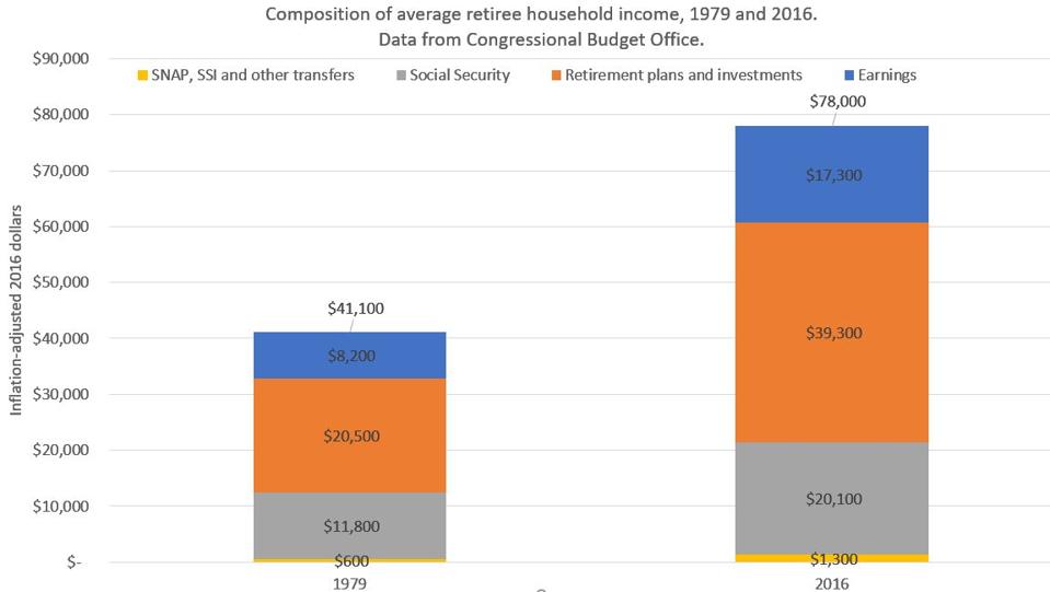 That’s why data released by the Congressional Budget Office are so important. The CBO figures are based on IRS data which more accurately capture the different sources of income that retirees rely on. And since the CBO data range from 1979 through 2016, we can see how retirees’ incomes have changed over time.