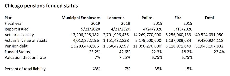 Here are two key charts summarizing Chicago’s pensions as of their last valuation date, at the end of 2019, that is, without any covid impacts on the liabilities or assets, first the key funded status figures,