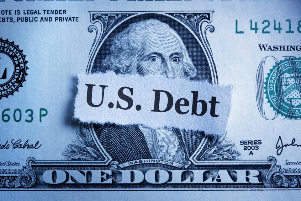 A torn piece of paper warning about the U.S. Debt rests on top of a U.S. one dollar bill. George … [+]