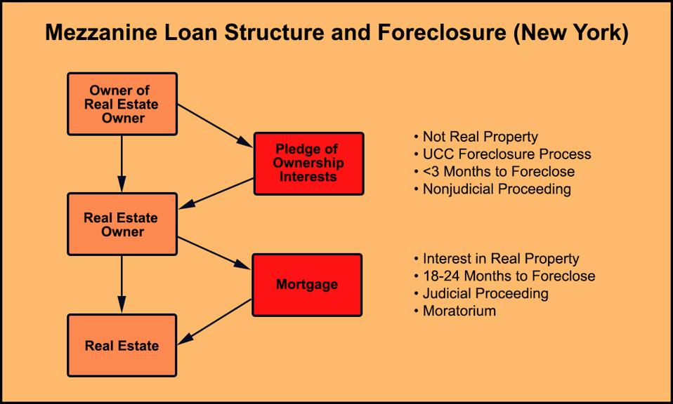 That’s because the collateral for a mezzanine loan isn’t a mortgage on real estate. Instead, the mezzanine borrower owns the company that actually owns the real estate. That company has already mortgaged the real estate to a mortgage lender. The collateral for the mezzanine loan consists of the mezzanine borrower’s ownership interests in the company that owns the real estate and got the mortgage loan. Those ownership interests are considered personal property, like a truckload of furniture. Foreclosures on personal property move quickly. They aren’t governed by the rules that slow down mortgage foreclosures.