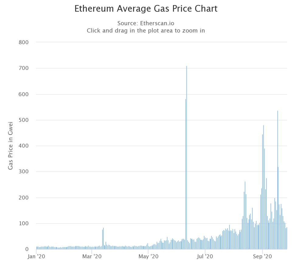 Gas is the transaction fee you have to pay to the Ethereum network to execute transactions. Gas is measured in gwei, a subunit of the ether cryptocurrency. As transactions increase on the Ethereum network, gas prices go up. As you can see in the chart below, over the past few months, average gas fees steadily rose while spiking on multiple occasions due to the congestion caused by DeFi activity. As a result, every time you move your coins in the Ethereum network, there is a hefty transaction fee you have to pay which reduces your profits and/or transacted value.