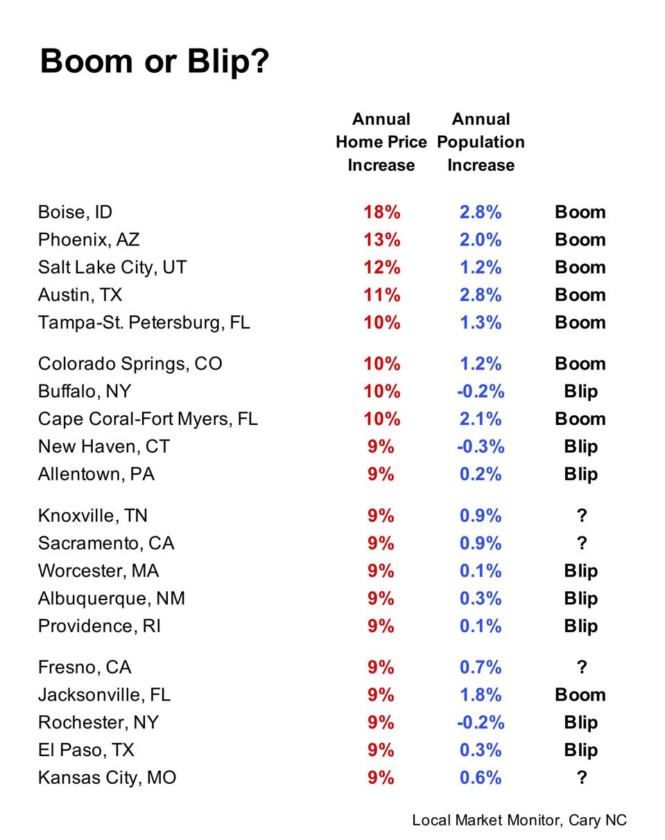 Our table shows 20 markets where home prices were at least 9 percent higher in the past year. Based on recent population growth I’ve classified them as booms, where prices will keep rising briskly in the next year – or blips, where prices may still increase but much more moderately. And some markets are in-between.