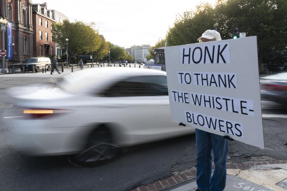 A demonstrator holds a sign reading “Honk To Thank The Whistleblowers” near the White … [+]