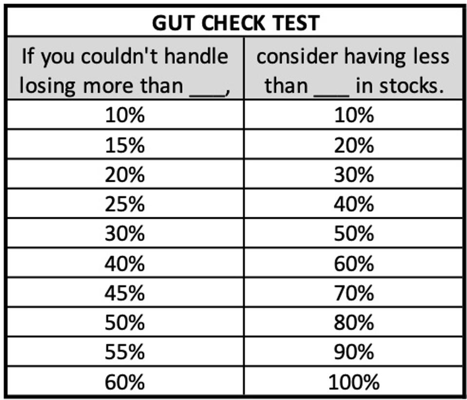 Instead, consider acknowledging this reality—and your own personal willingness to endure risk. Then offset the growth engine of your portfolio—your exposure to stock—with the stabilizing agent of the most conservative, boring fixed income or bonds. Consider the following gut check test, the goal being to match your maximum tolerable loss with an appropriate maximum equity exposure: