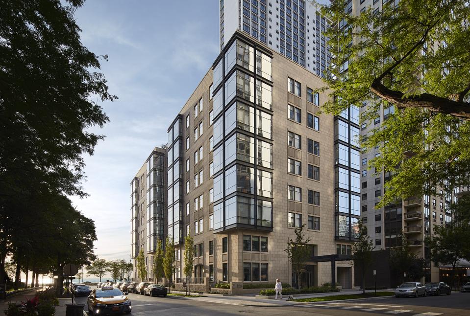 The building facade of Chicago’s One Bennett Park references Art Deco-era luxury.