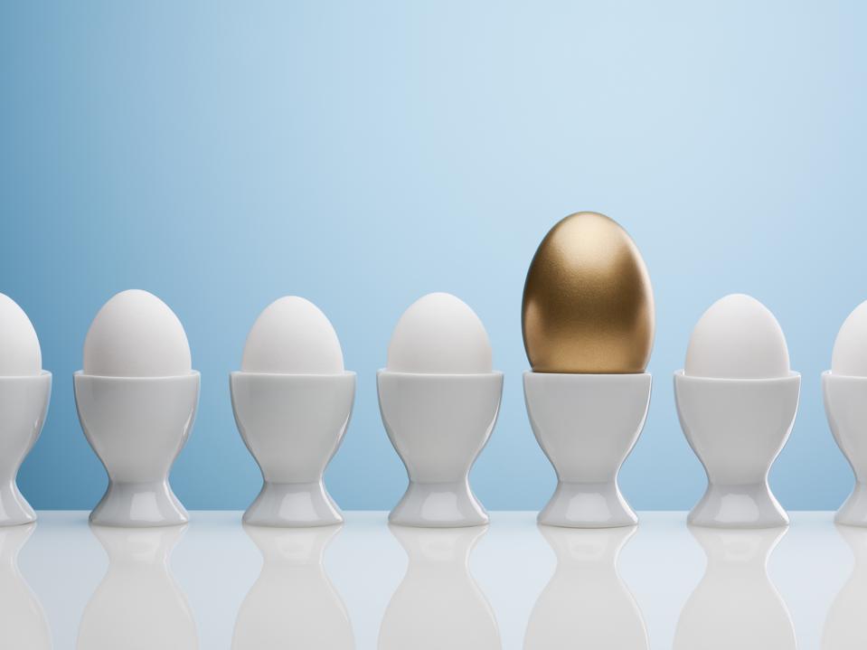 A golden egg in a line of white eggs.