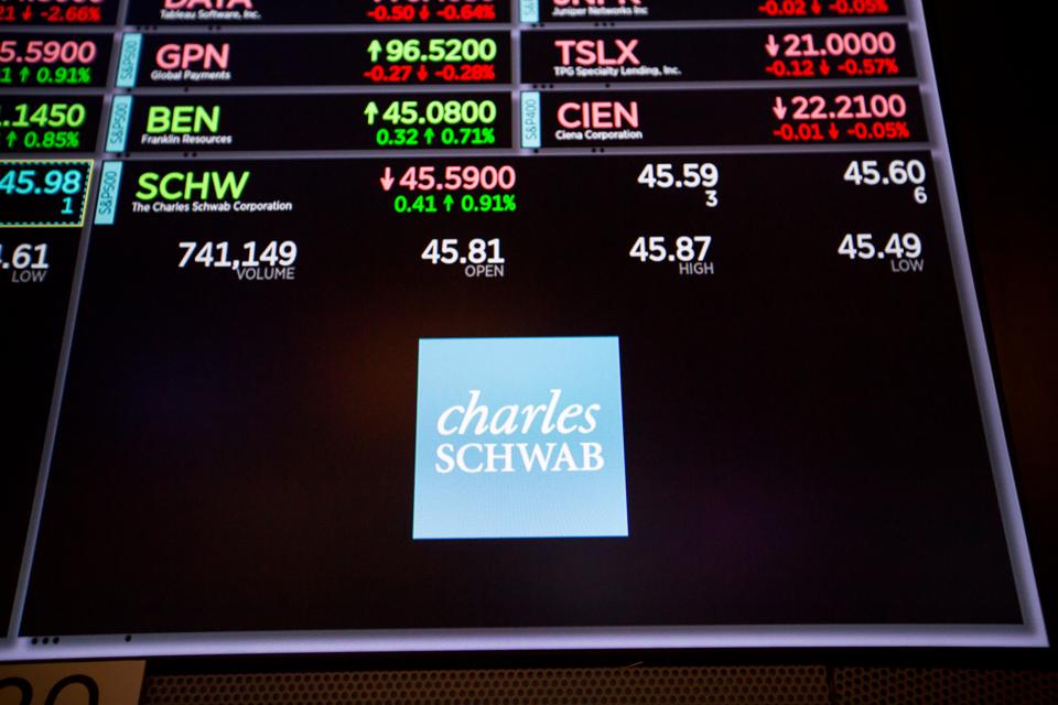 A monitor displays Charles Schwab Corp. signage on the floor of the New York Stock Exchange (NYSE) … [+]