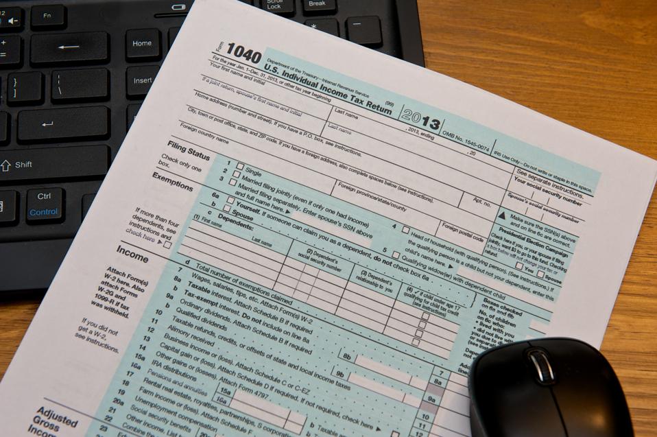Tax Filing Electronically with an IRS 1040 Tax Form on top of a computer keyboard and mouse.
