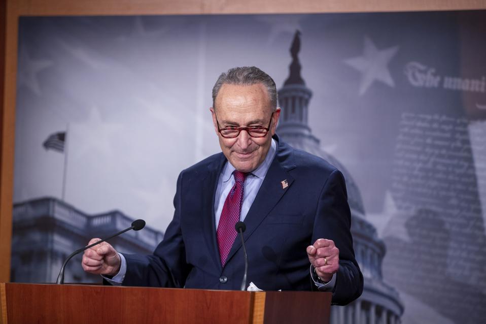 WASHINGTON, DC – MARCH 06: U.S. Senate Majority Leader Sen. Chuck Schumer (D-NY) speaks to the … [+]