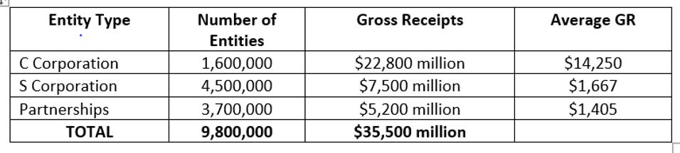 In 2015, which is the most recent IRS reporting for all entity types, there was a reported 1.6 million C Corporation returns reflecting $22.8 billion of gross receipts. Alternatively, there were 4.5 million S Corporations and 3.7 partnerships with combined gross receipts reported of approximately $12.8 billion, $5.2 billion for partnerships and $7.5 billion for S Corporations, respectively.