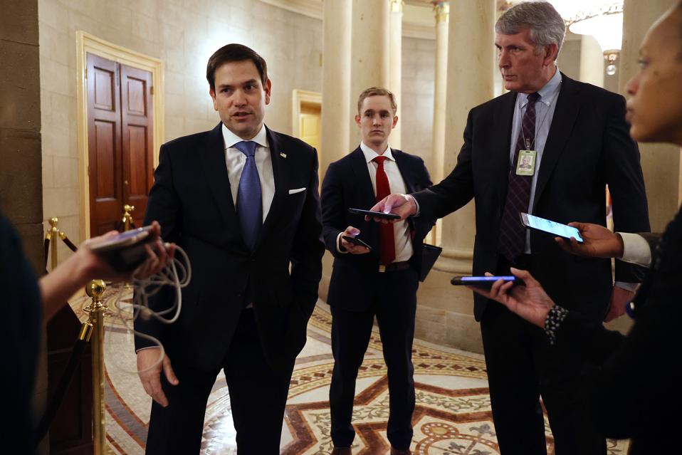WASHINGTON, DC – MARCH 24: Sen. Marco Rubio (R-FL) talks to reporters after leaving a meeting with … [+]