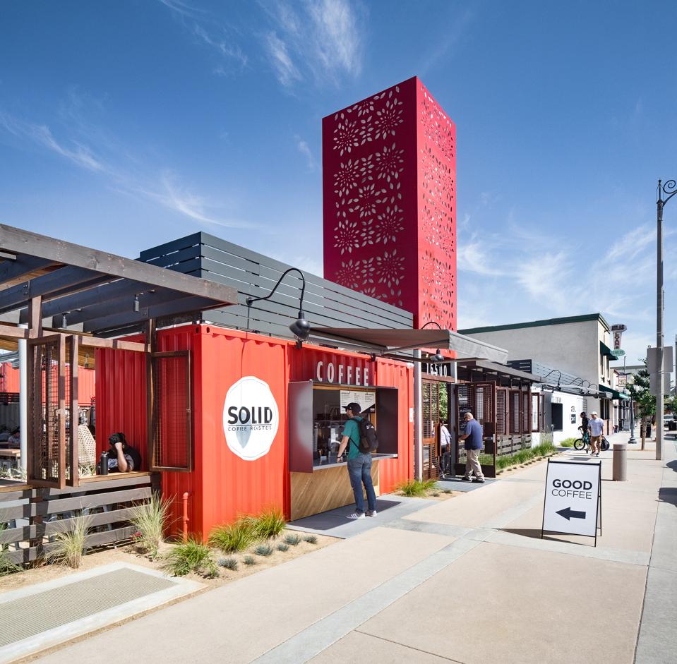 BELLFLOWER, Calif. – Architecture, urbanism and landscape-design firm, Studio One Eleven recently completed an innovative commercial real estate project, transforming discarded shipping containers into a robust al-fresco food hall in downtown Bellflower, California. Bellflower is considered a “first-ring” suburb of Los Angeles, and early findings indicate that the project has spurred revitalization efforts in the area.
