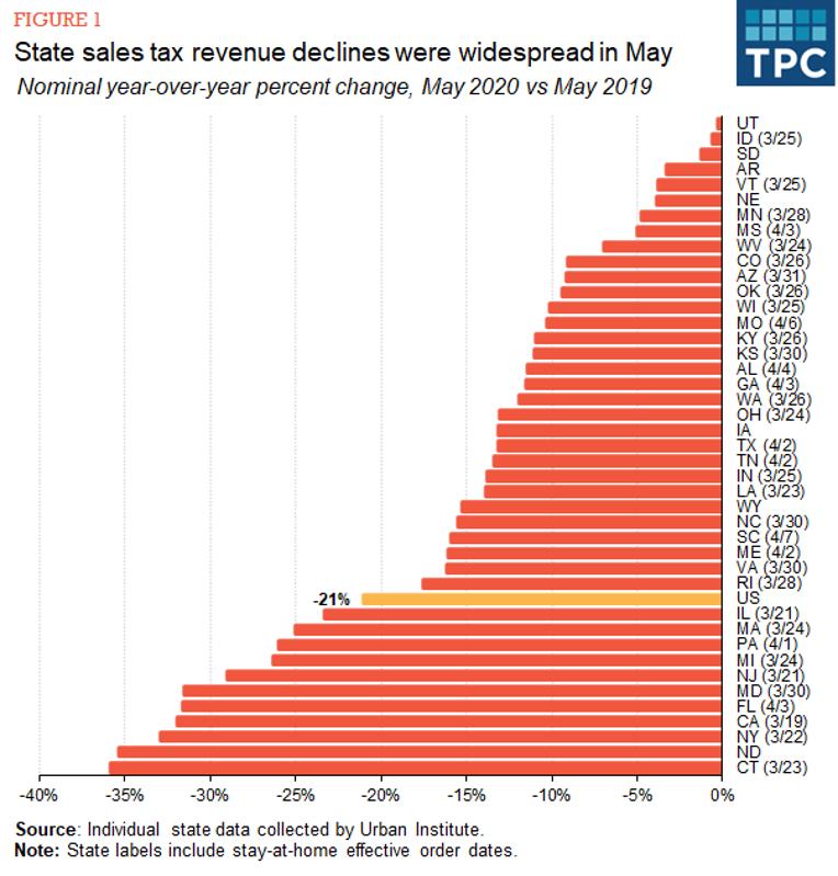 May state sales tax receipts shrank by nearly $6 billion, or 21 percent, compared to May 2019, according to data compiled by the Tax Policy Center. State stay-at-home orders, decisions to close businesses, states’ sales tax filing and payment deadline extensions, and COVID-19 cases all contributed to the freefall of sales tax revenues.