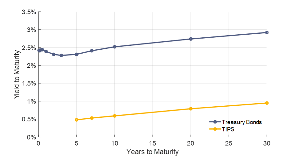 Bonds with more distant maturity dates typically offer higher interest rates than bonds with earlier maturity dates. This is not always the case, but in the exhibit, we do see this effect, even though it is more muted than usual. For treasuries, a thirty-year treasury was yielding 2.92 percent while a five-year treasury was yielding 2.31 percent, for instance. Likewise, with TIPS the real yield for a thirty-year maturity was 0.95 percent, compared with 0.48 percent for a TIPS with a five-year maturity.