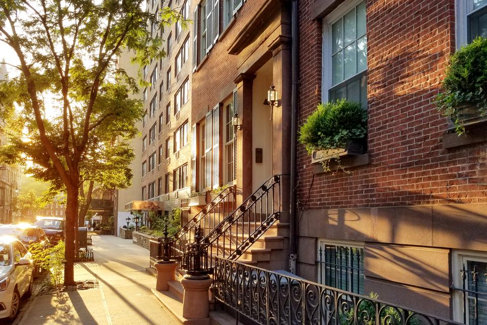 Old brownstone buildings along a quiet neighborhood street in Greenwich Village, New York City.