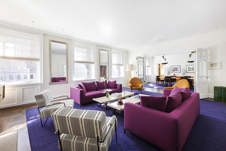 Grange’s eye for detail is on display throughout the third-floor apartment, which hit the market last week for $12 million. The front-corner layout features high ceilings and gallery walls that play up the colorful accent pieces. Handsome wood floors run throughout the residence, furthering the link between old and new.
