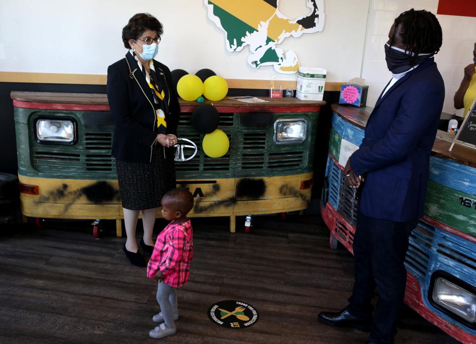 BOSTON, MA – OCTOBER 1: SBA administrator Jovita Carranza, left, meets with Jamaica Mi Hungry … [+]