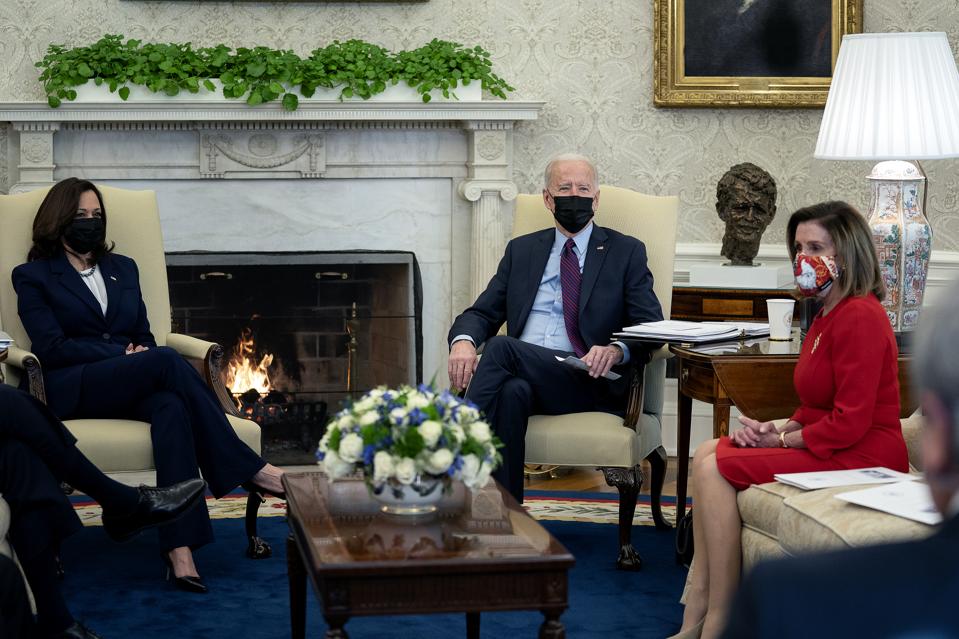 WASHINGTON, DC – FEBRUARY 05: U.S. President Joe Biden (C) and Vice President Kamala Harris (L) meet … [+]