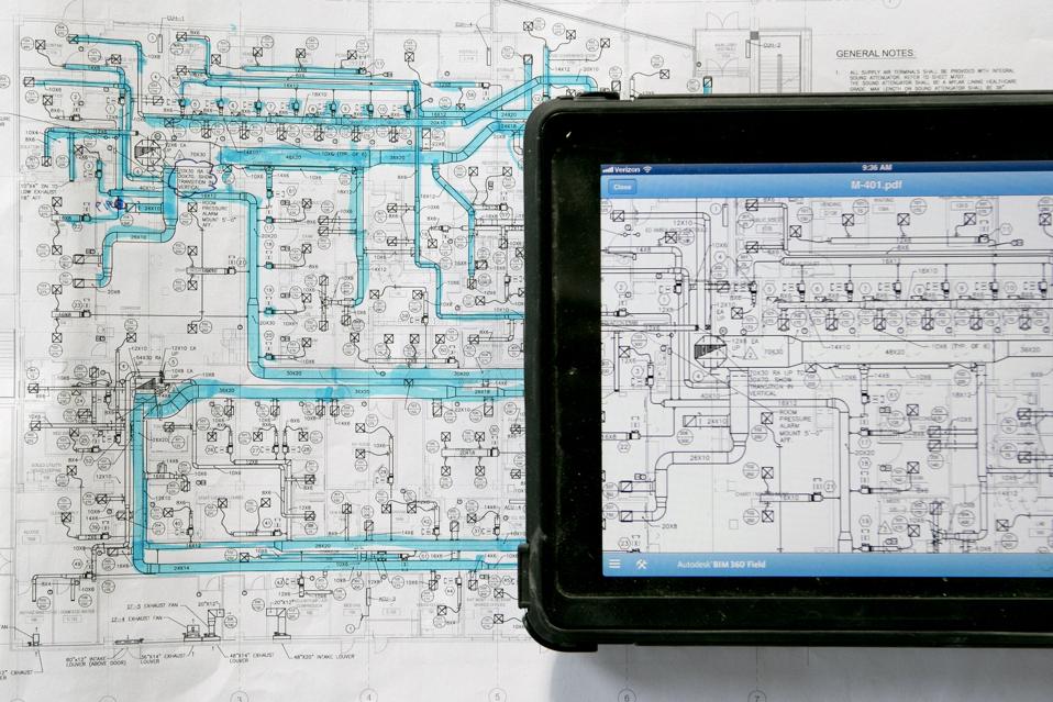An Apple Inc. iPad displays Autodesk Inc. architectural drawings next to paper blueprints in this arranged photo at a Skanska USA Building Inc. Inova Health System construction site in Lorton, Virginia, U.S., on Thursday, Jan. 3, 2013. The rolls of