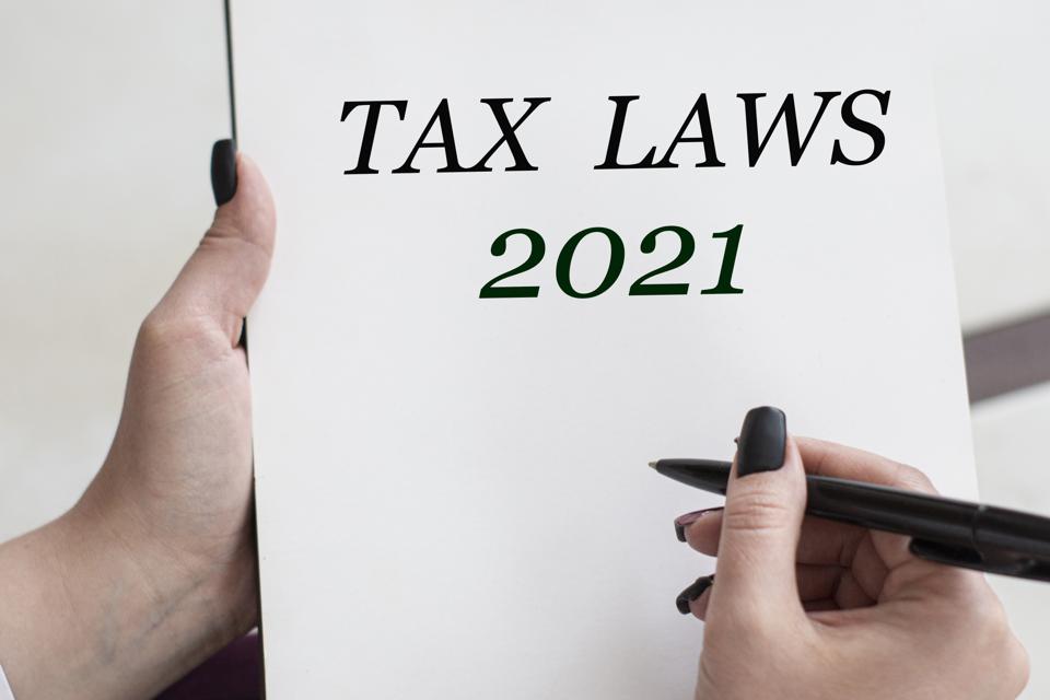words TAX LAWS 2021 writes girl on a blank white sheet. Business concept.